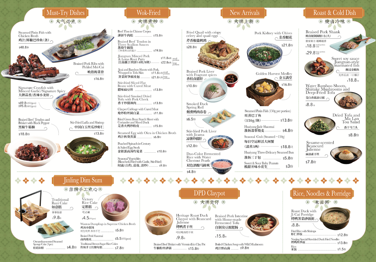 The menu features a tantalizing array of dishes that highlight centuries-old culinary techniques. Signature dishes like the Jinling Roast Duck offer succulent meat with crisp skin, while the Huadiao Wine Drunken Crayfish surprises with its tender, flavorful meat paired with fragrant wine. Satisfy your cravings with delightful bites such as Celestial Roast Duck Dumplings and Poached "Lion’s Head" Meatball, both bursting with authentic flavors.
